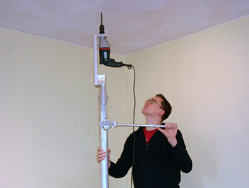 Deckenbohrständer, Löcher über Kopf bohren, Bohrständer, Dübellöcher, Befestigungslöcher an Decke, Deckenisolation festschrauben, Deckenisolation befestigen, Installation an Decke befestigen, Installationstrassen, Deckenabhängung, Bohrungen für Deckentrocknung,
